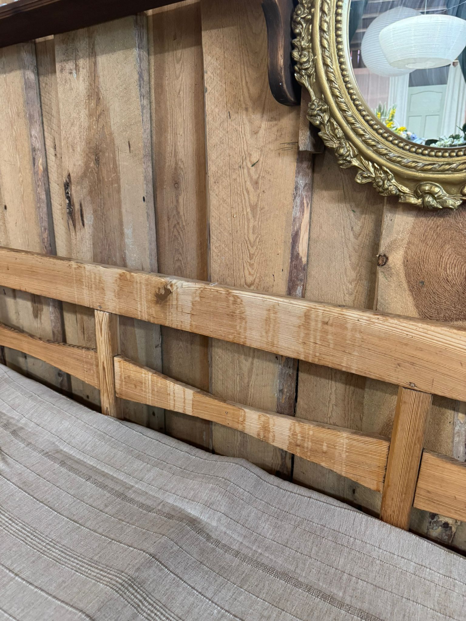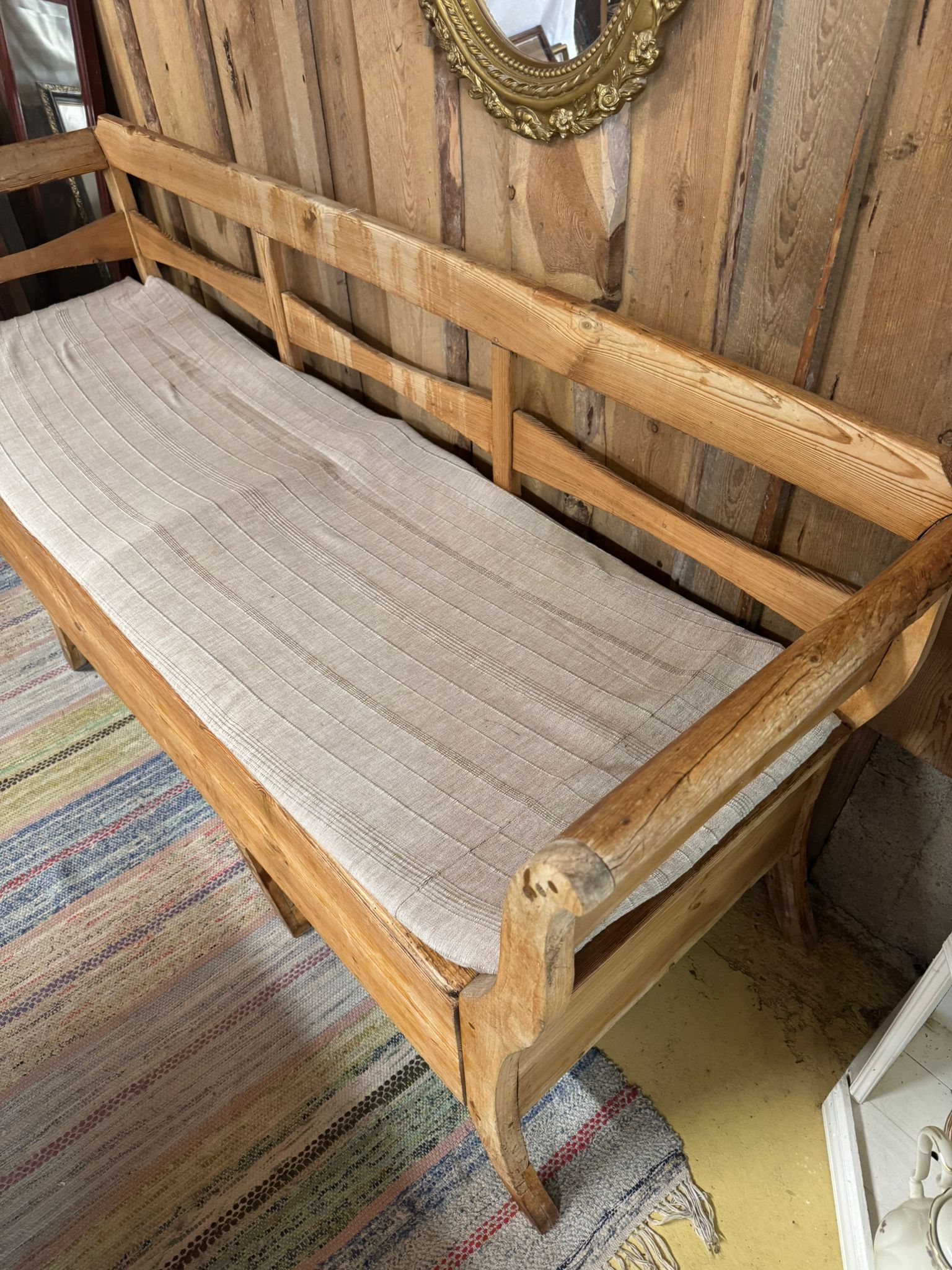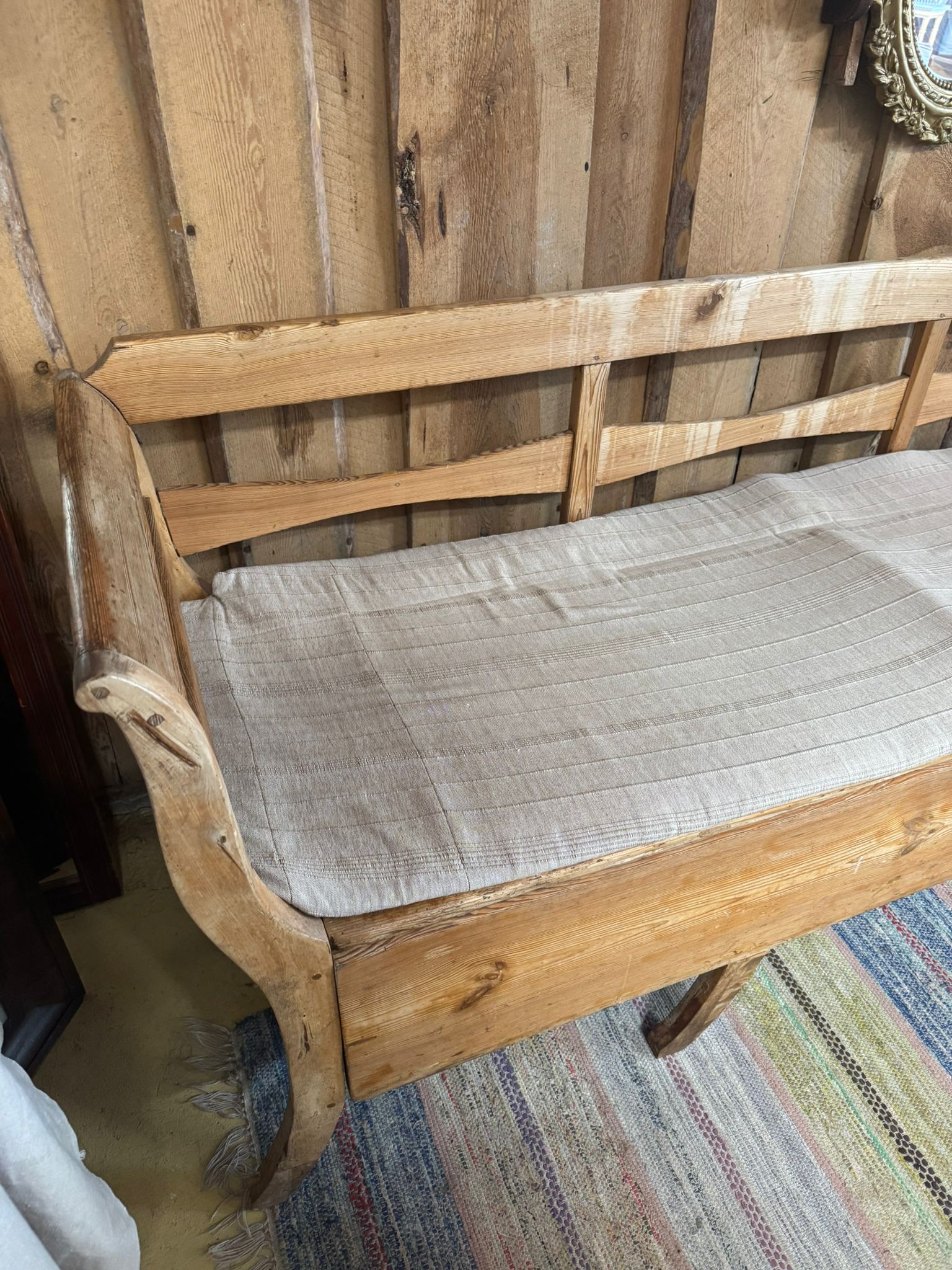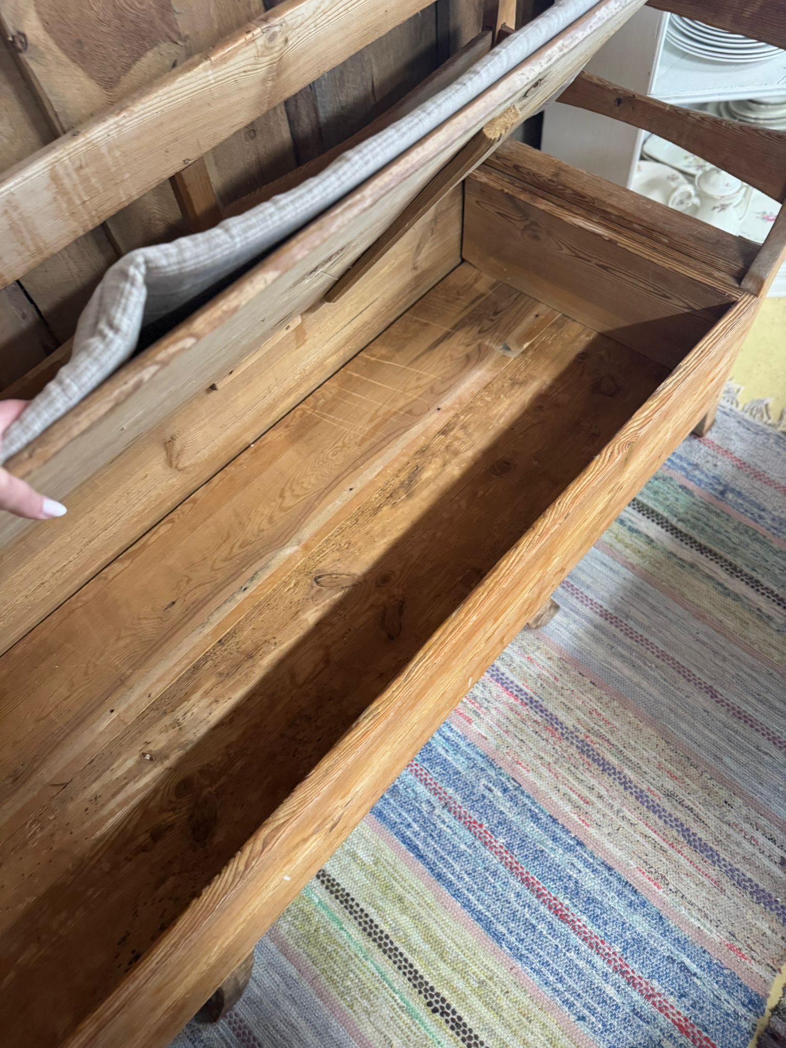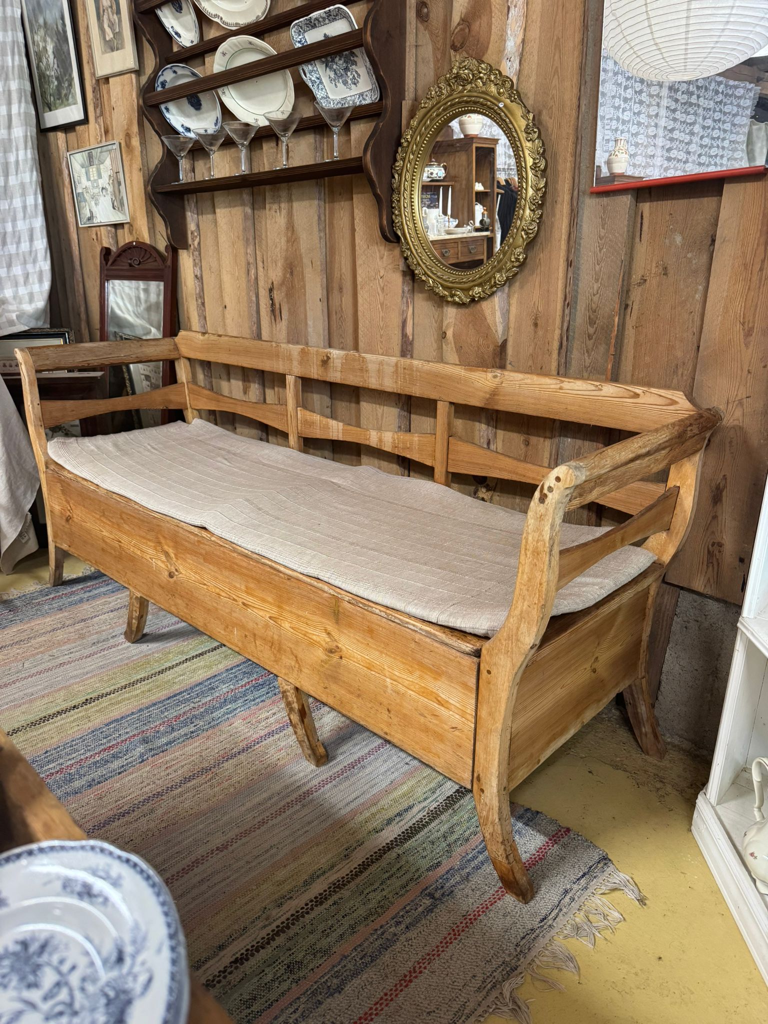 OM:Äldre trären kökssoffa med förvaring samt dyna i beige.
