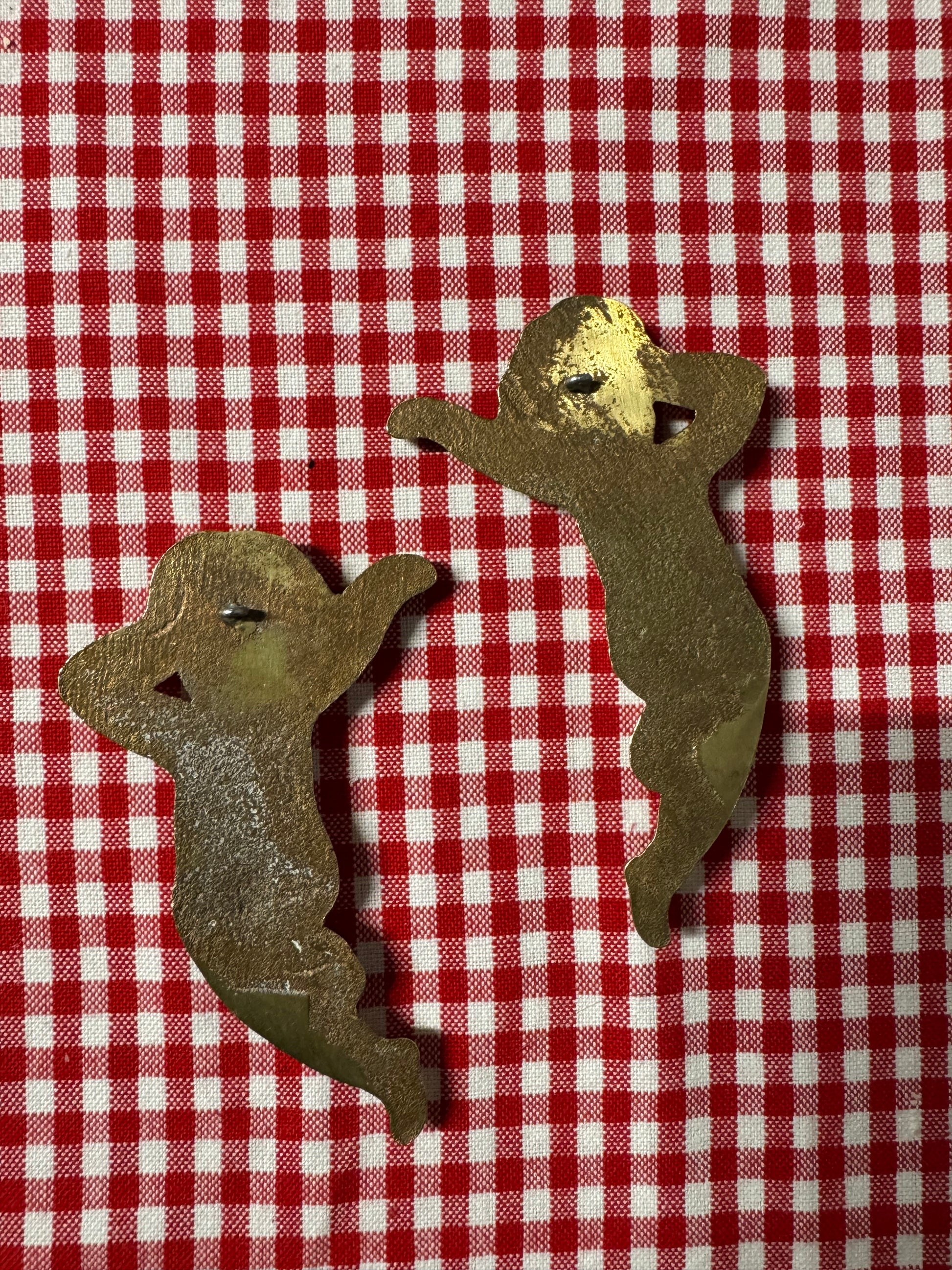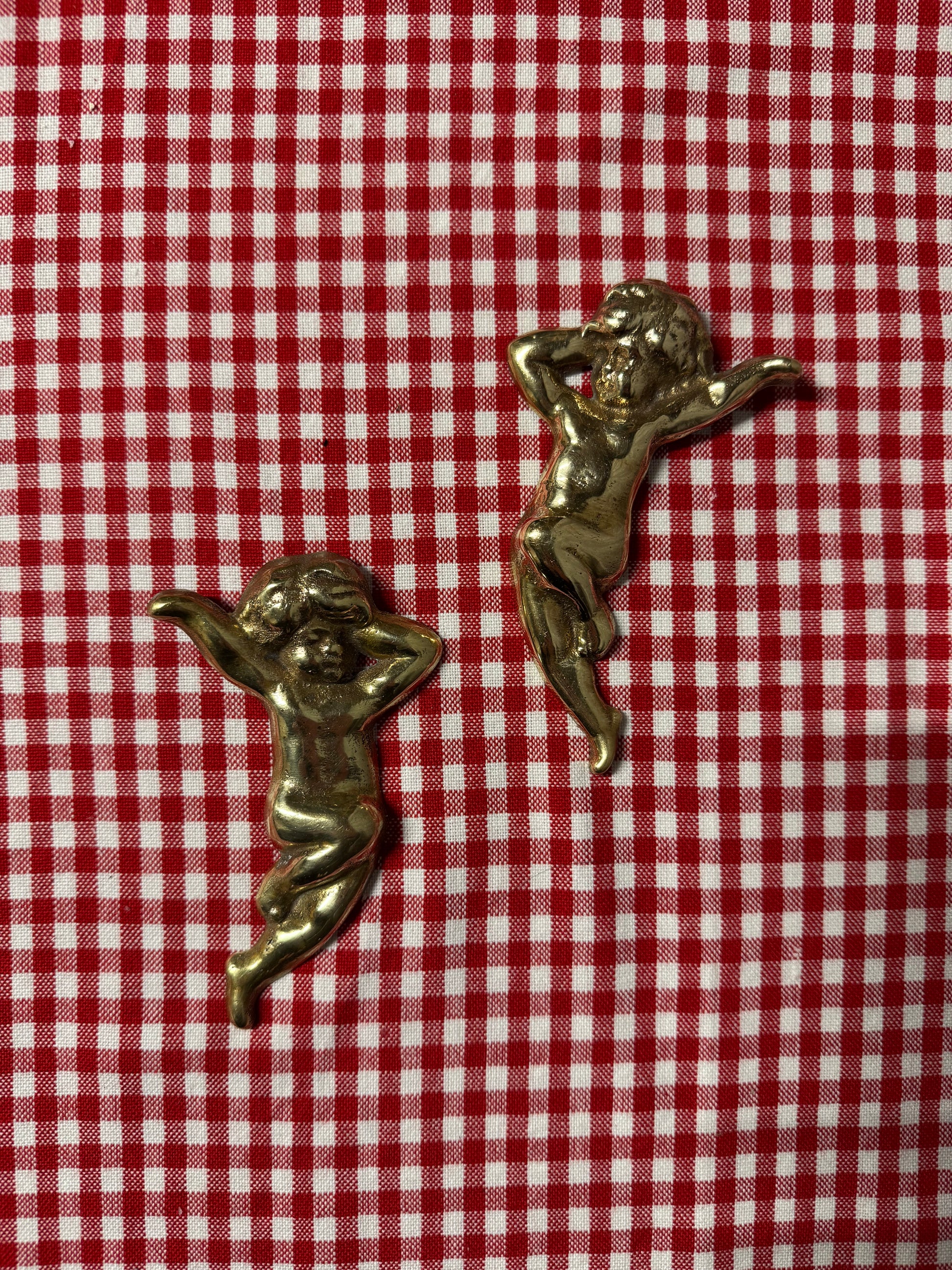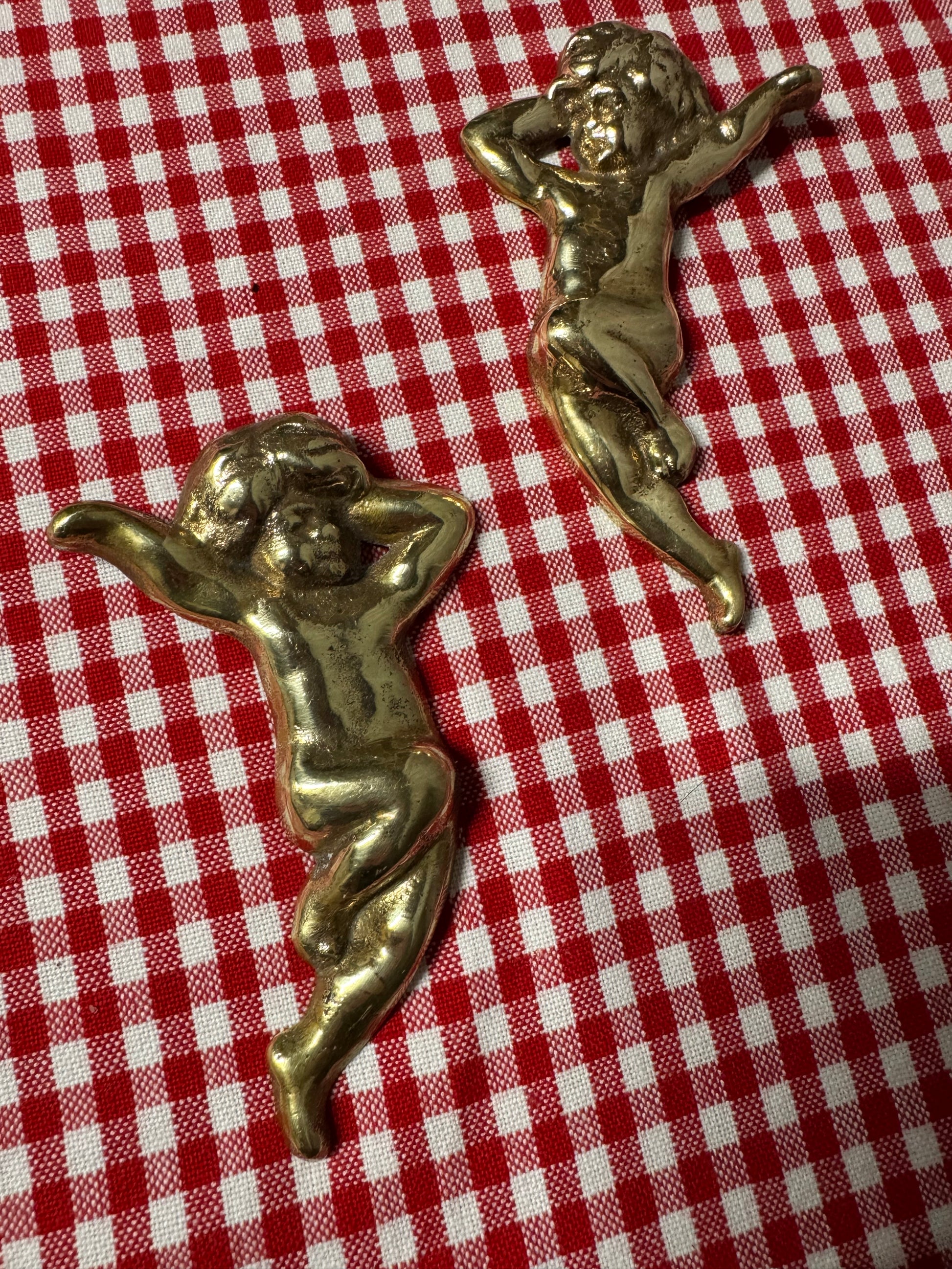 OM:Änglar i mässing med lite tyngd. Att hänga på vägg eller som dekoration i band om önskas. Putsade.