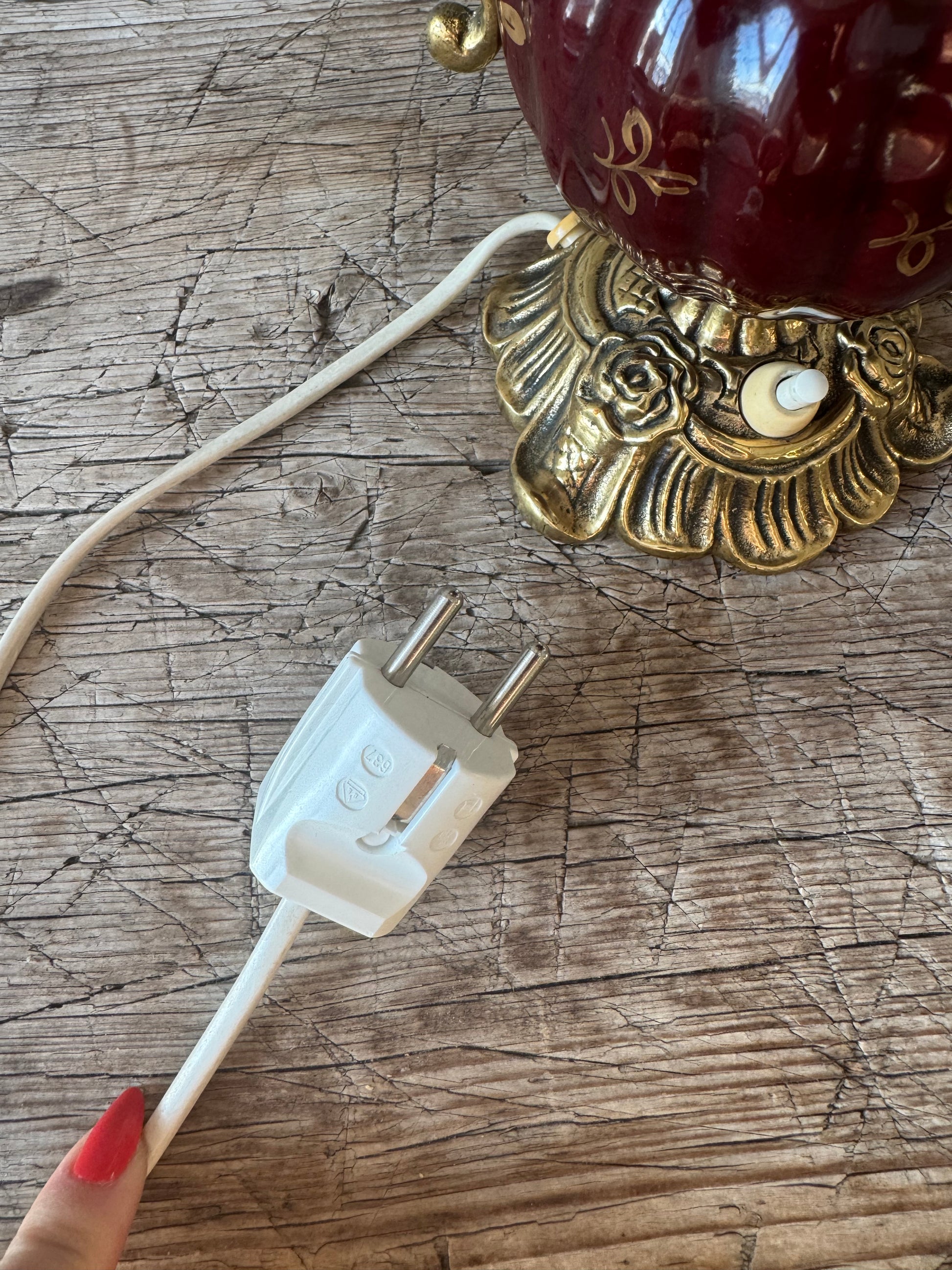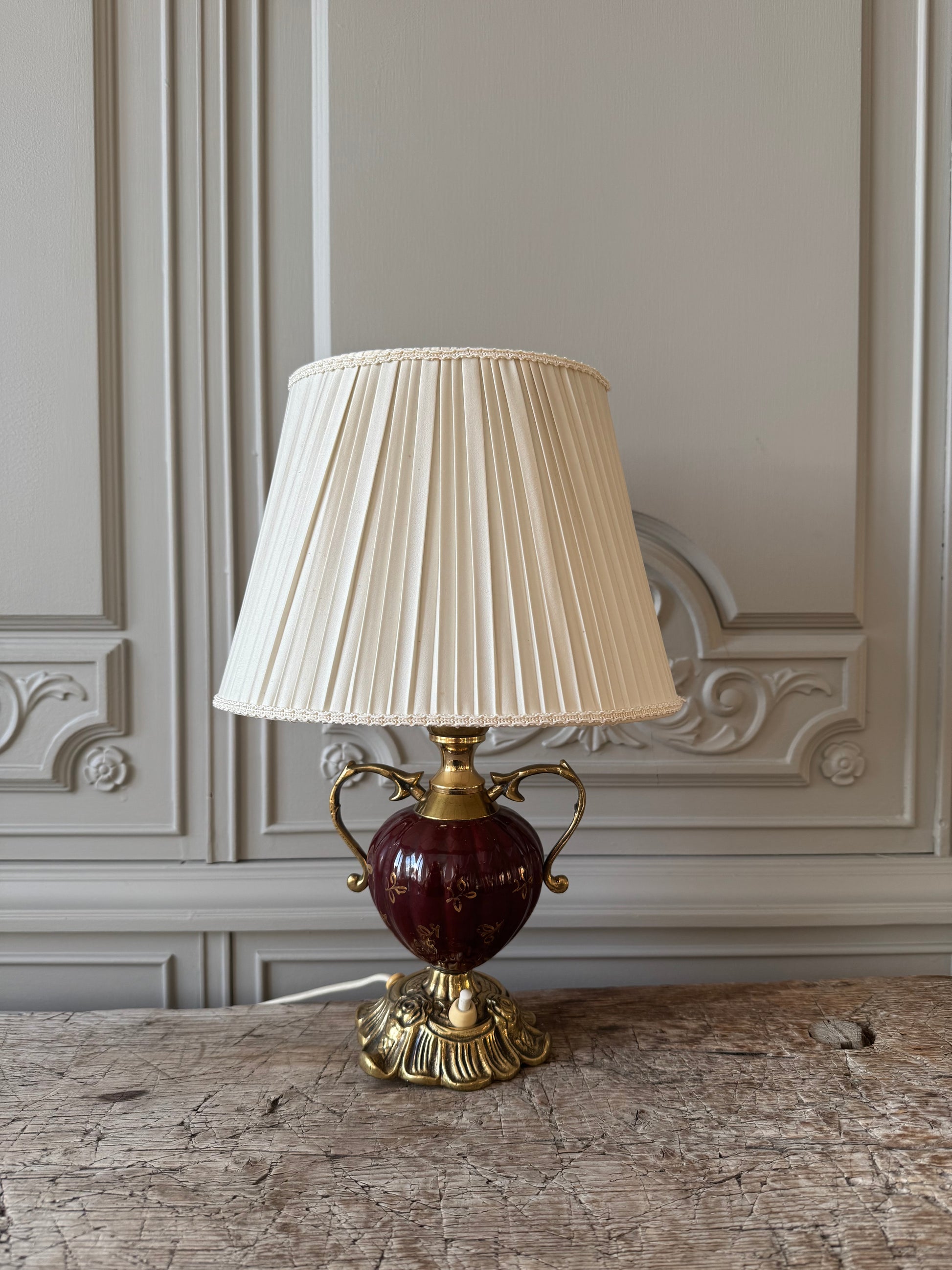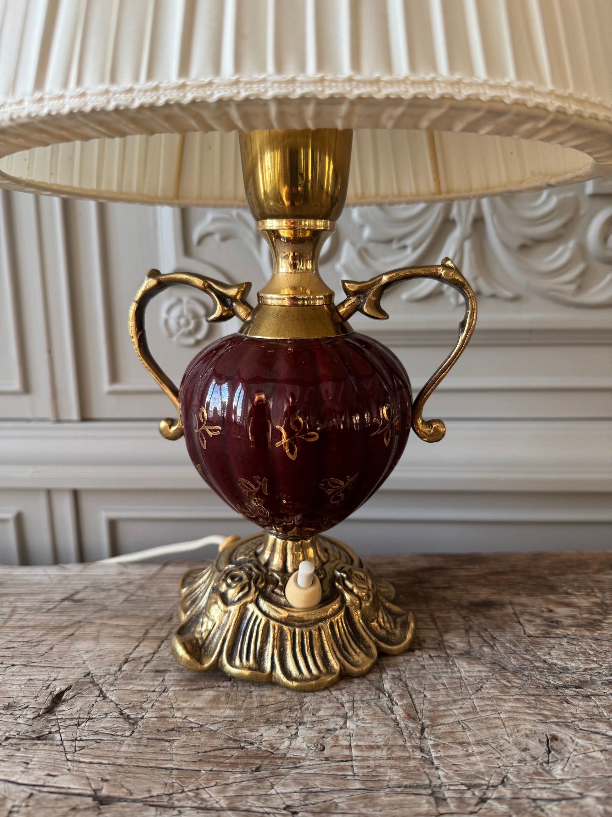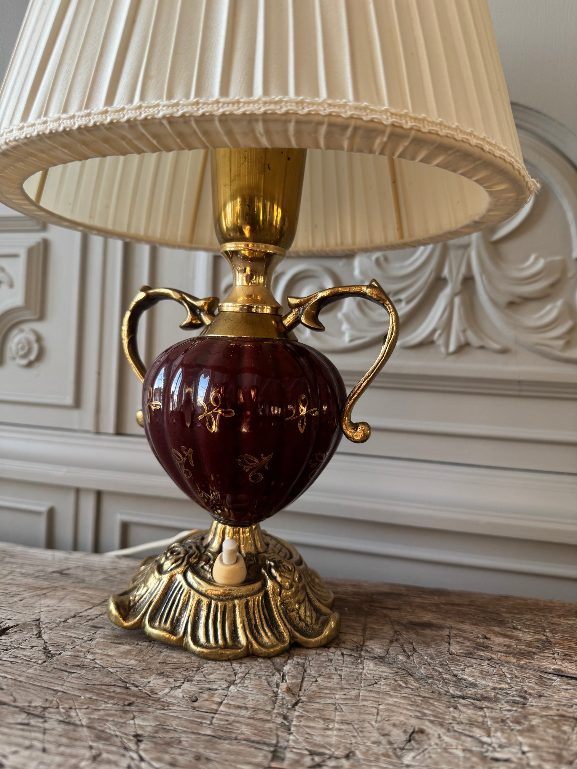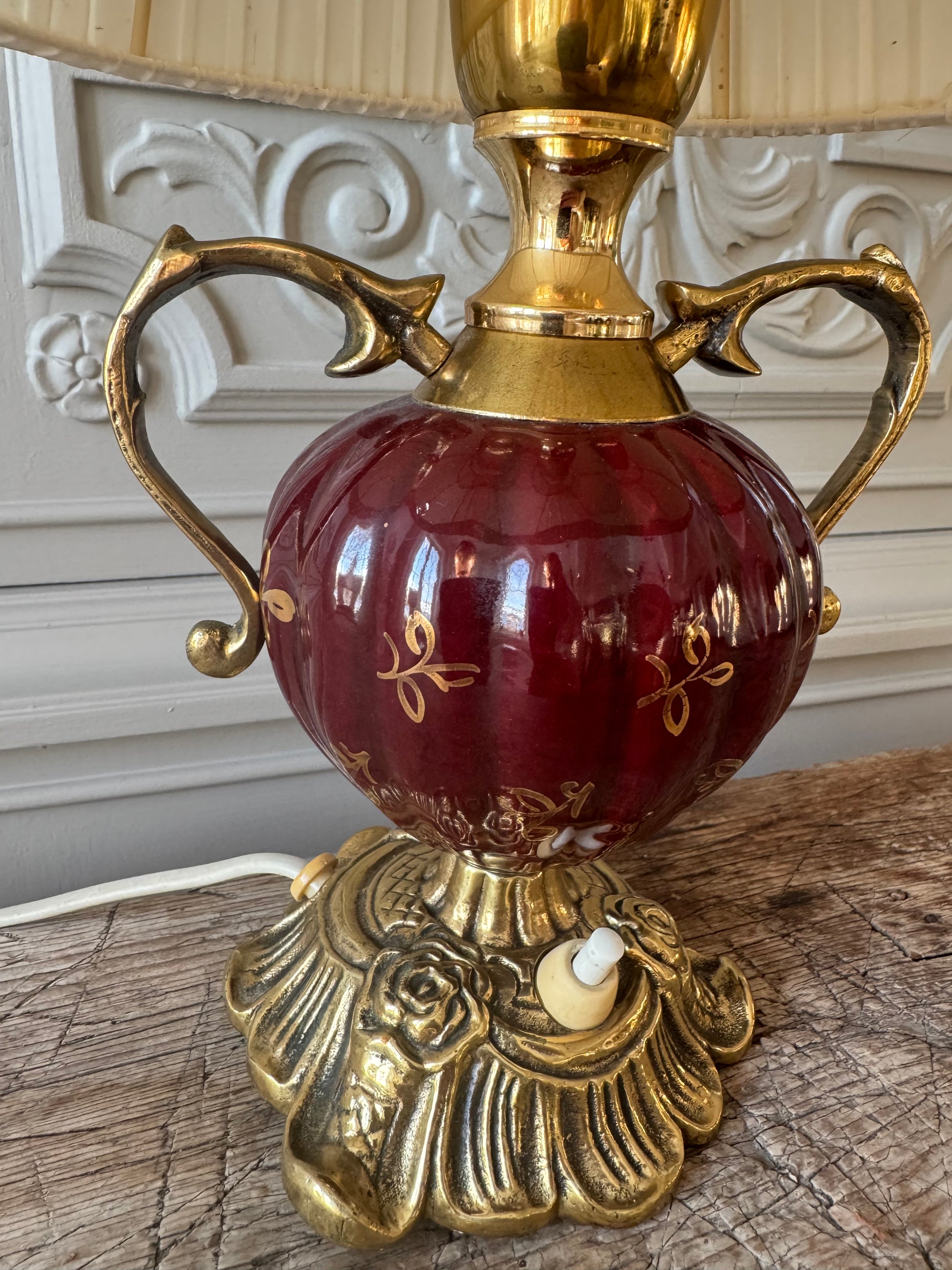 OM:Bordslampa med hänklar och fot i mässing Ewa Värnamo. Vinröd porslin.