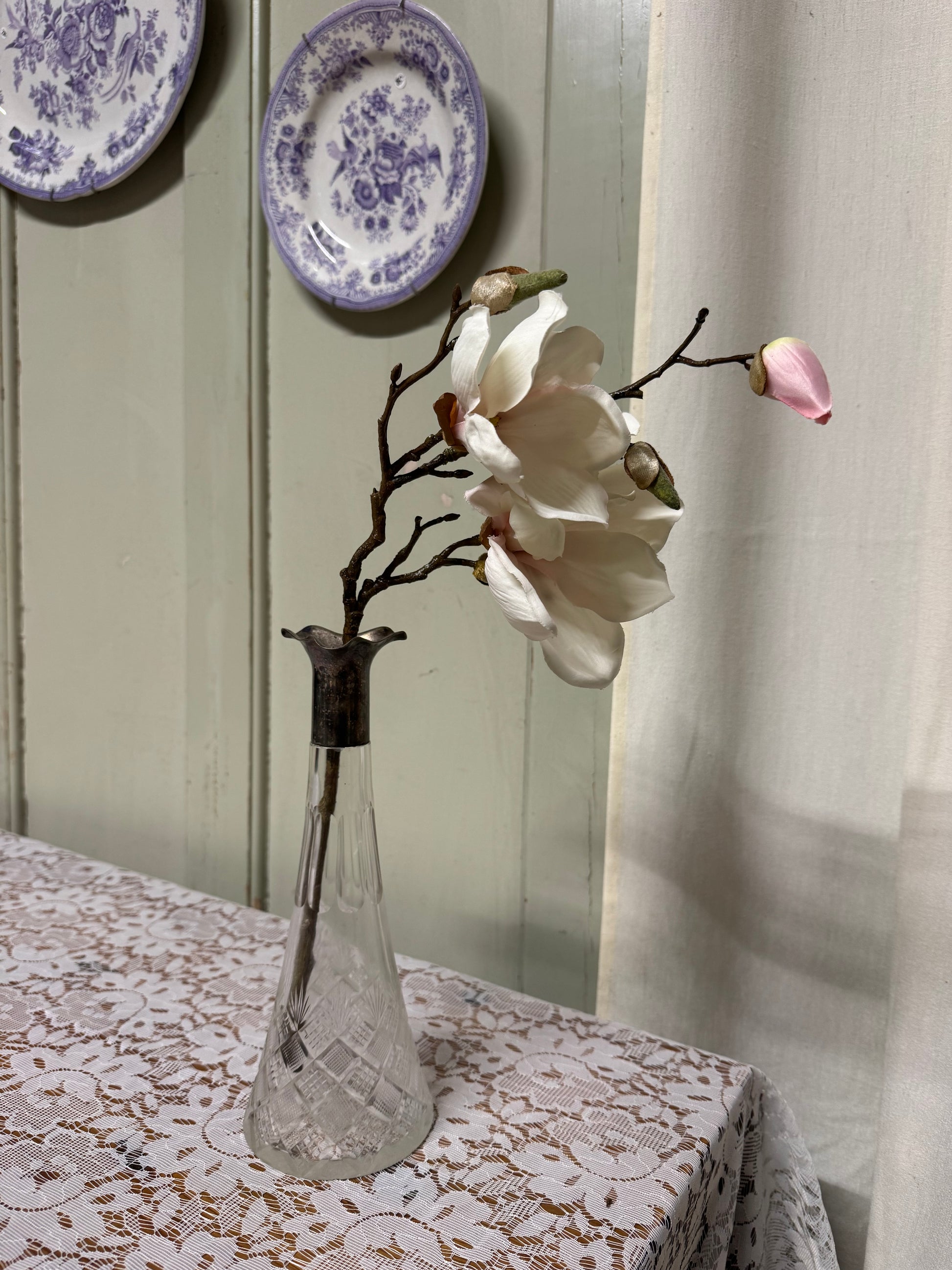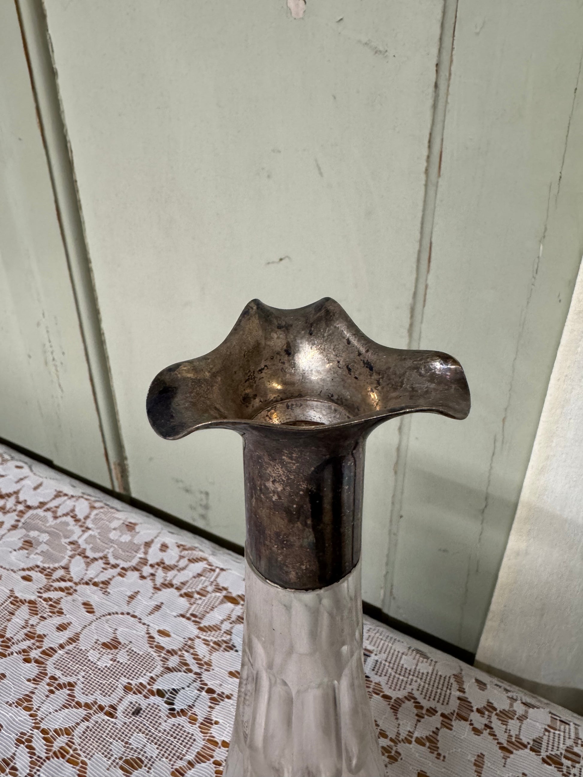 OM:Glasvas med vågat nysilver upptill, mellan. Går att använda som ljusstake också.