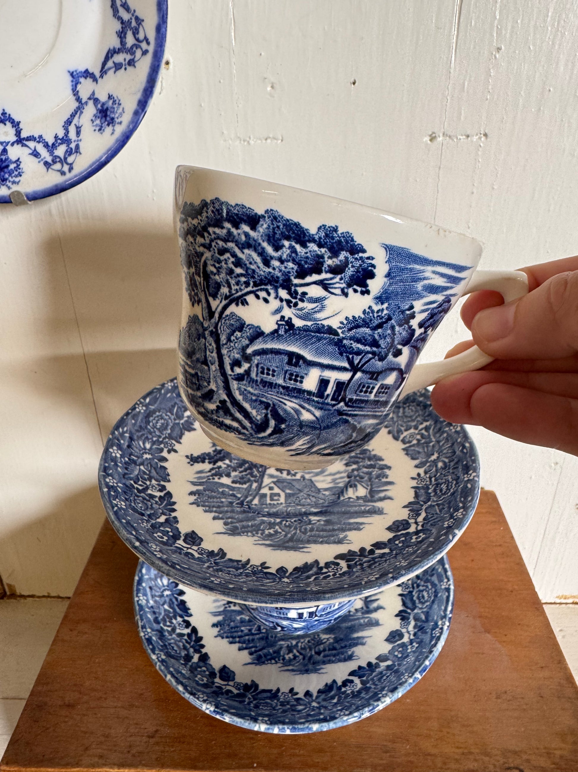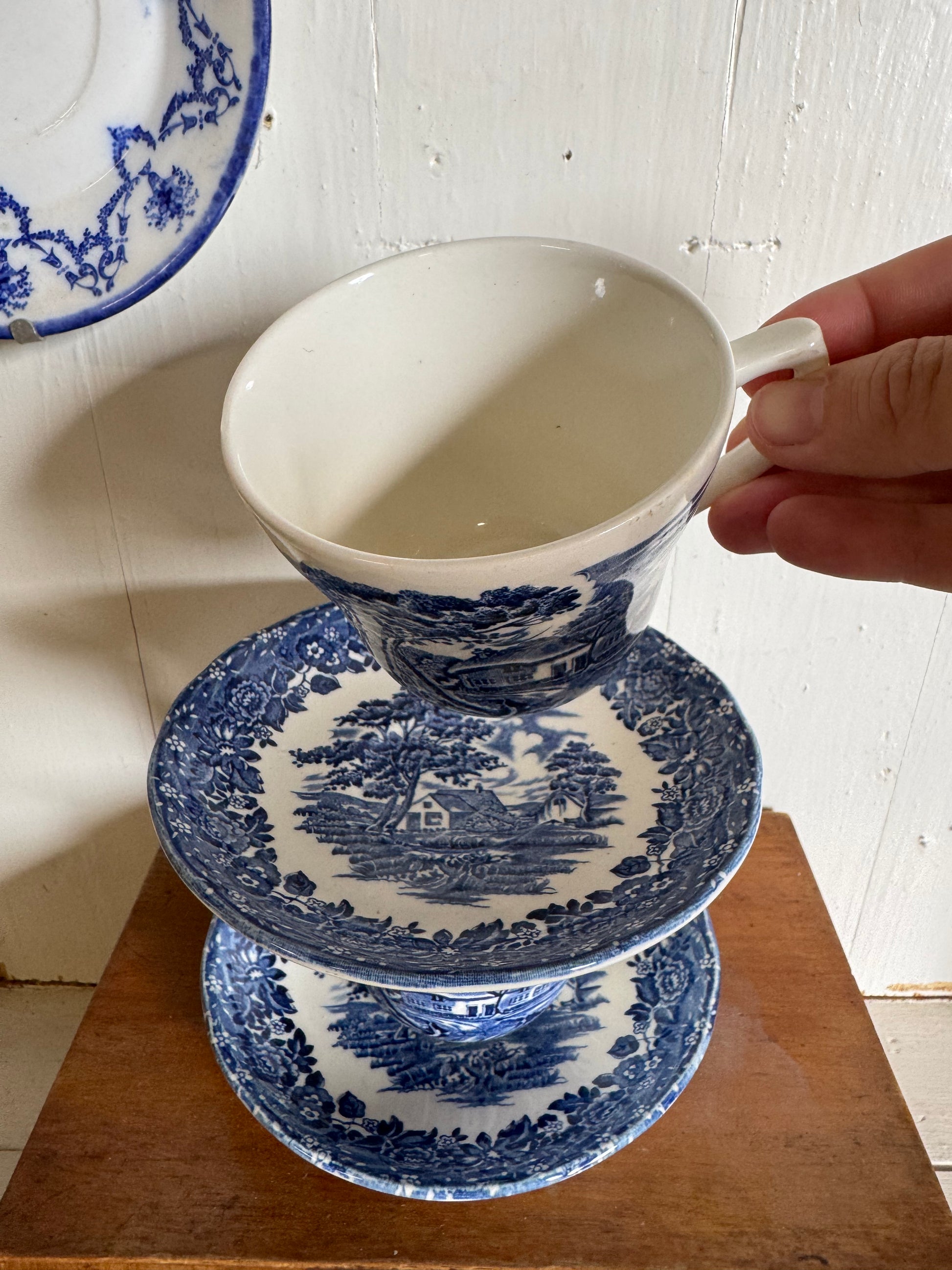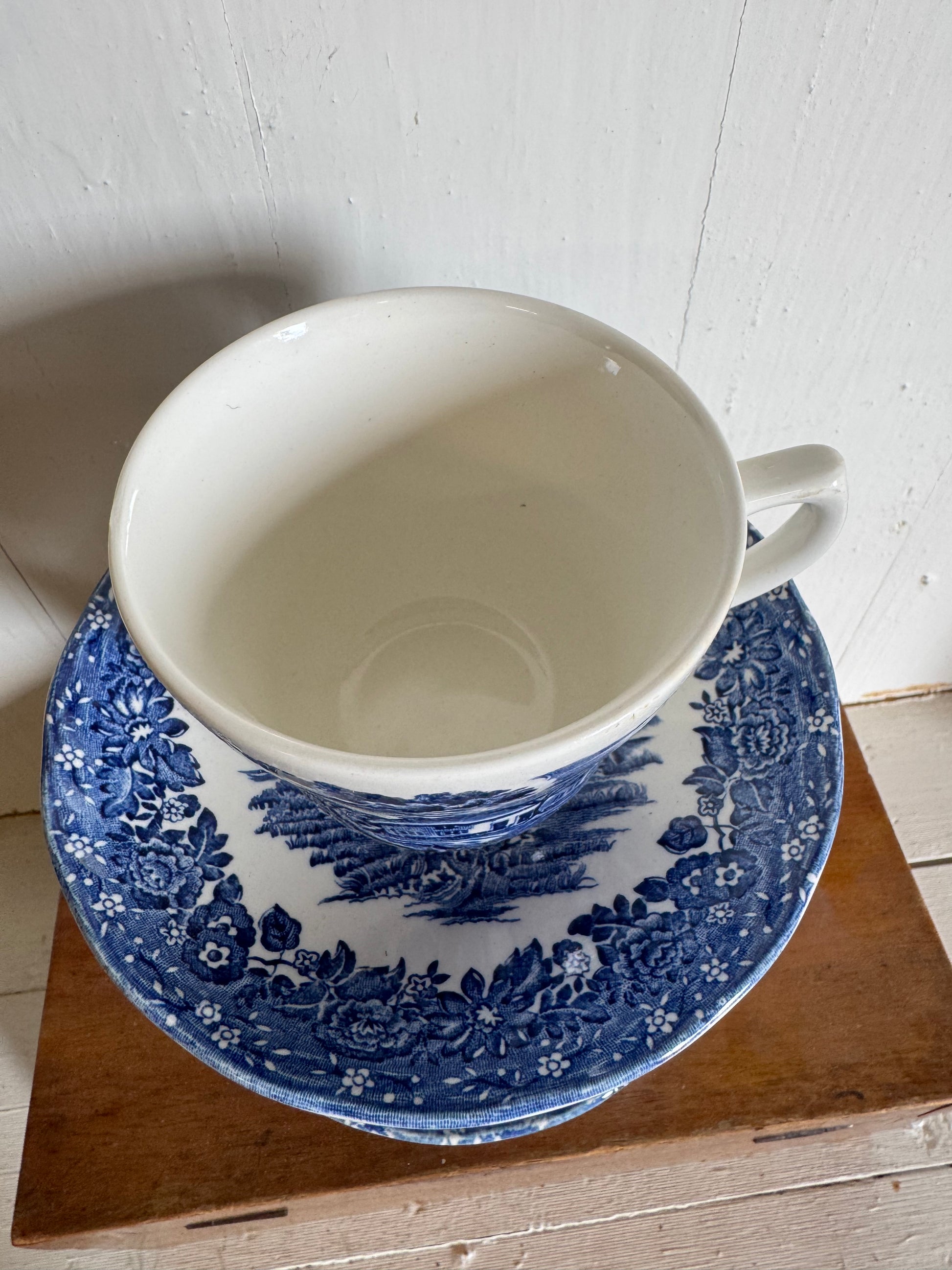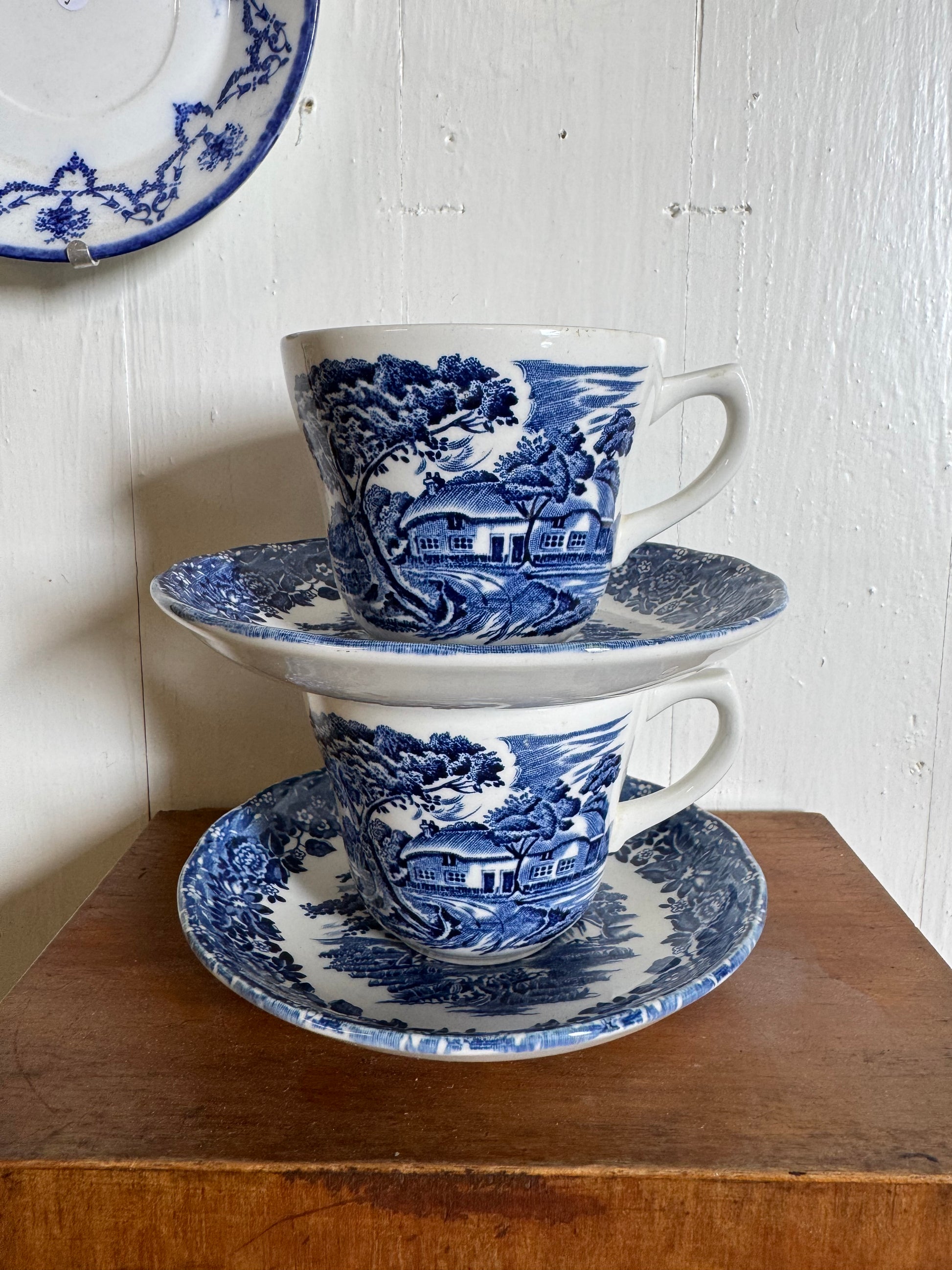 OM:Paret kaffekoppar med fat i blåvitt, engelskt porslin.