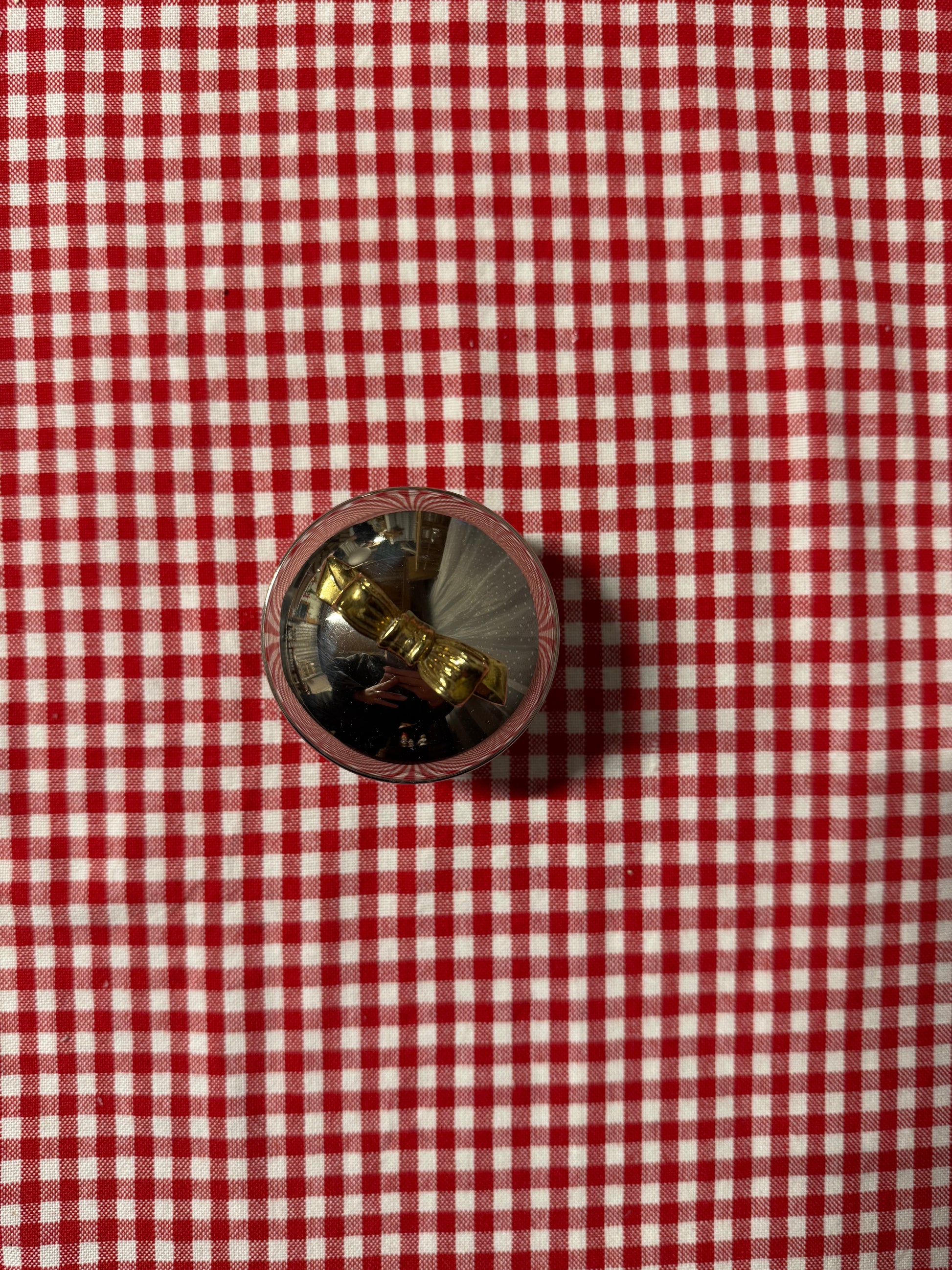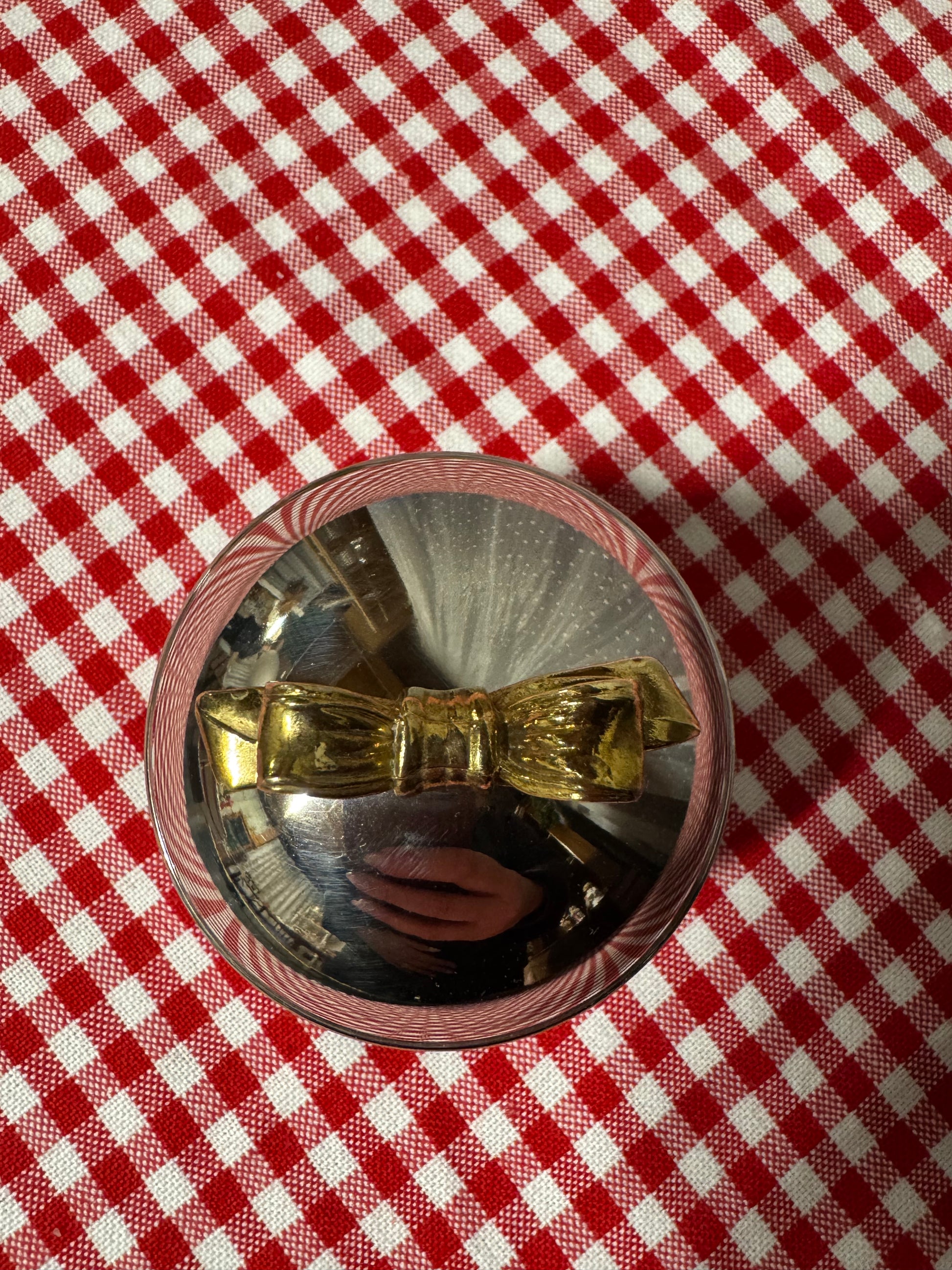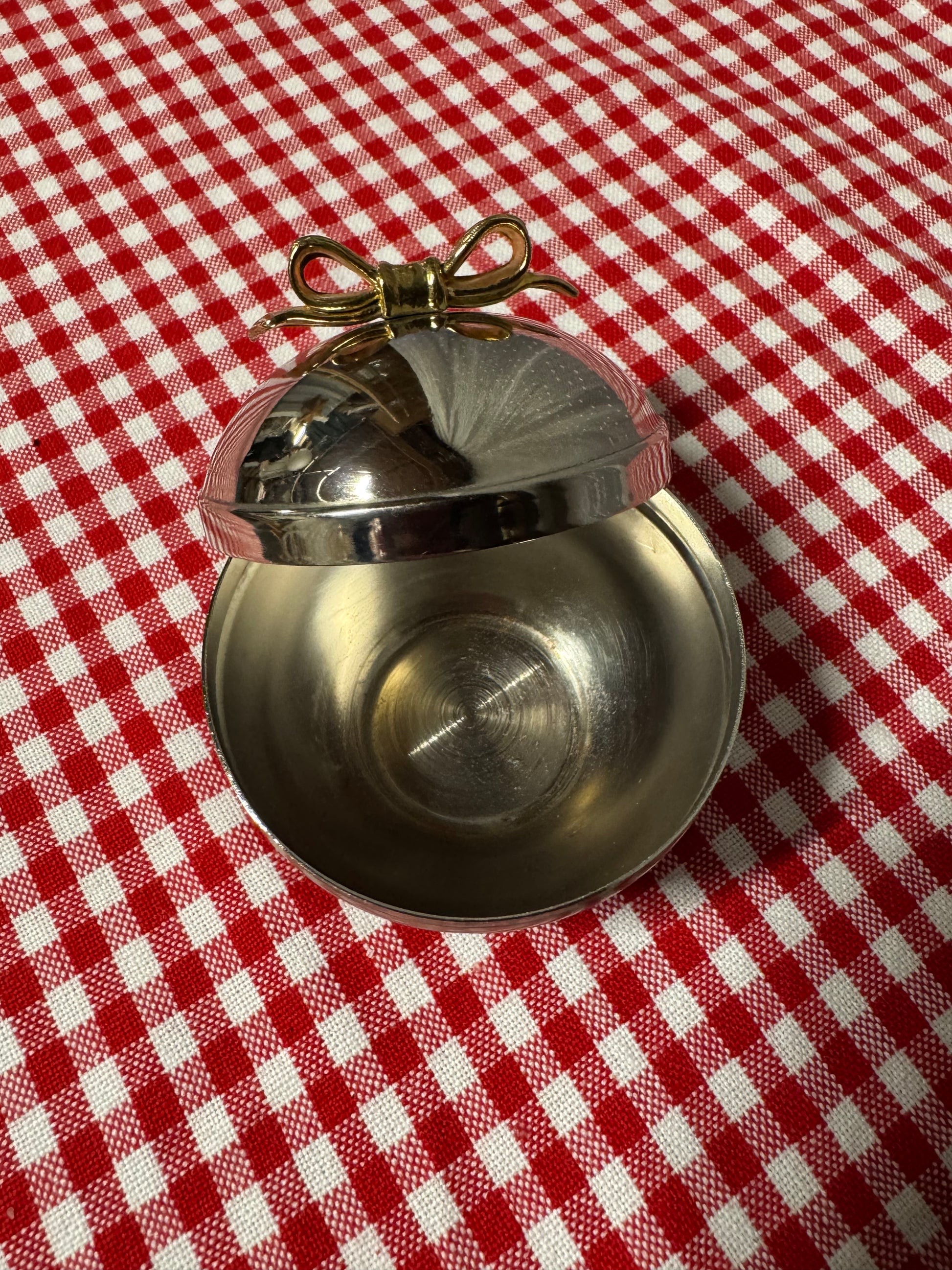Rund ask i nysilver med guldfärgad rosett