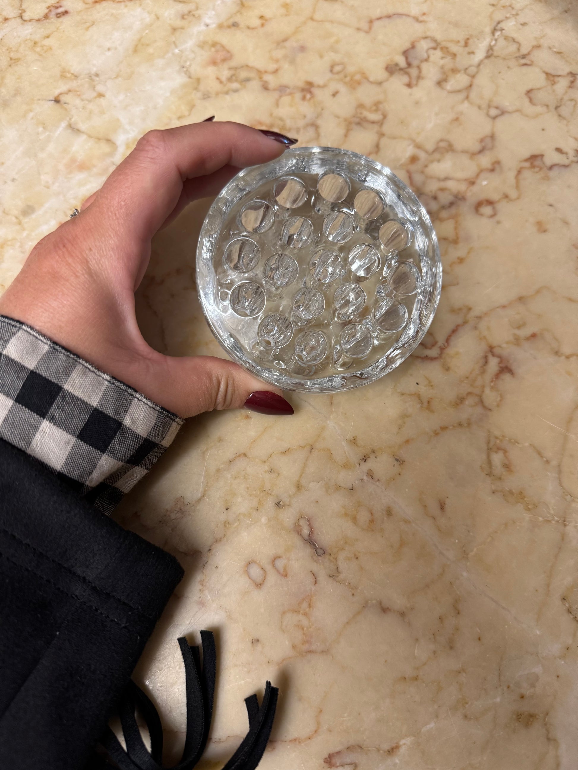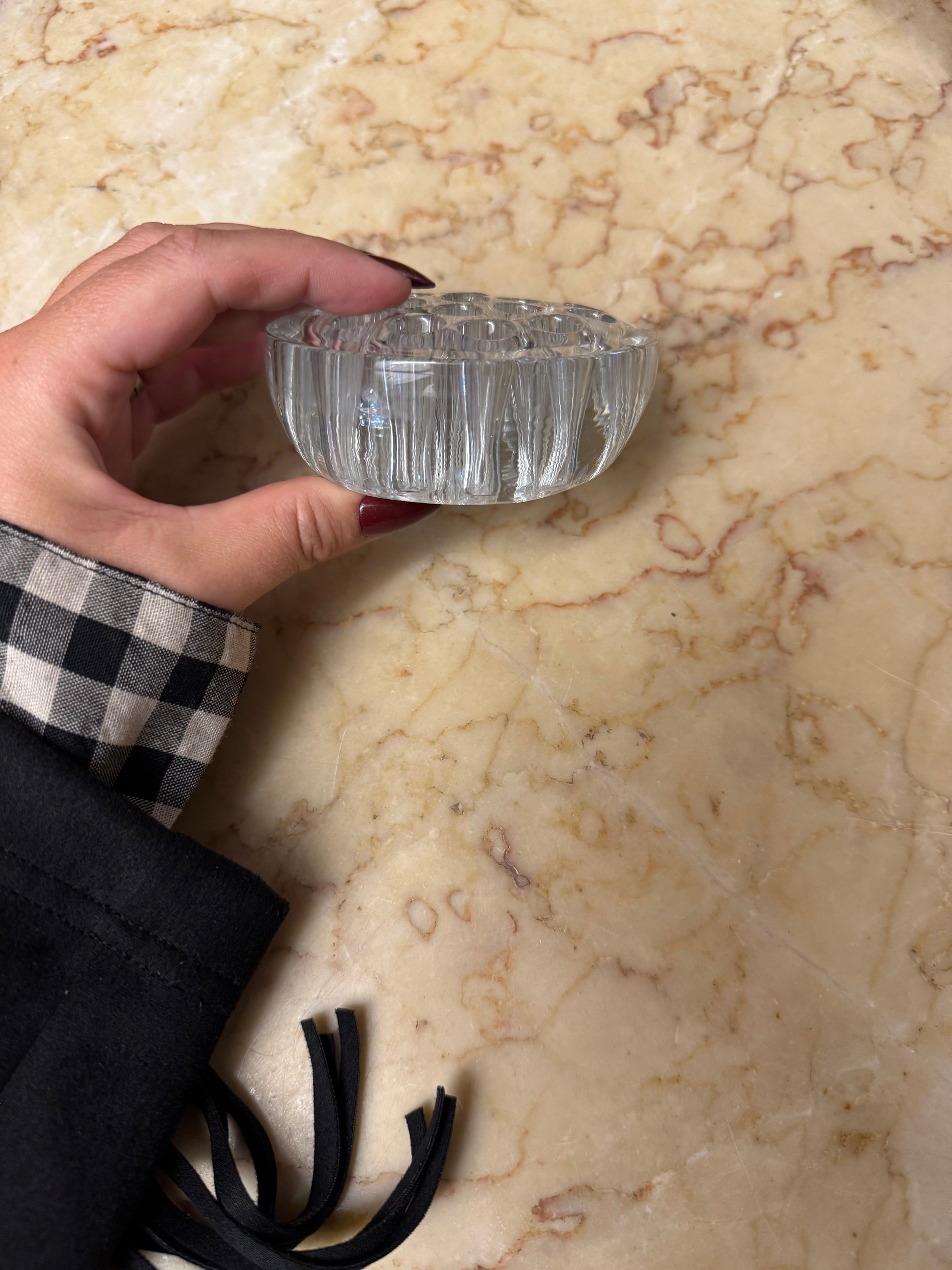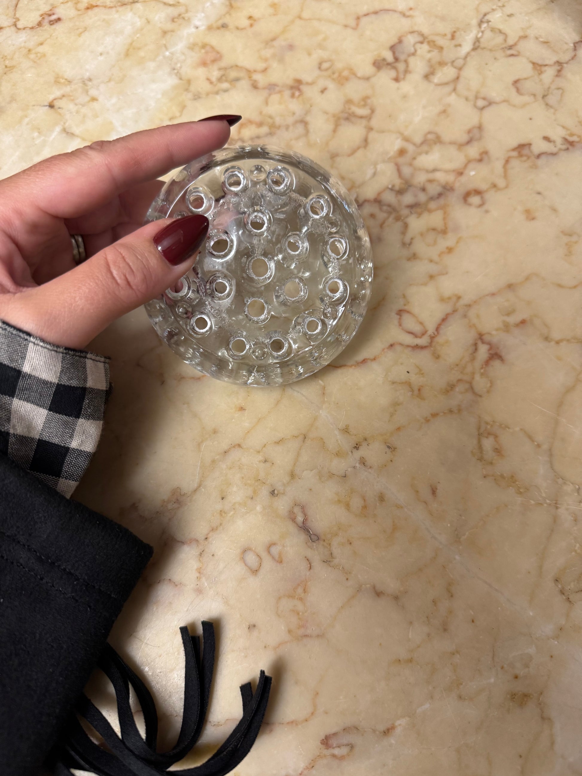 OM: 1 bomsterfakir i klarglas. Blomblock/blomhållare/oasis. 19 hål.
